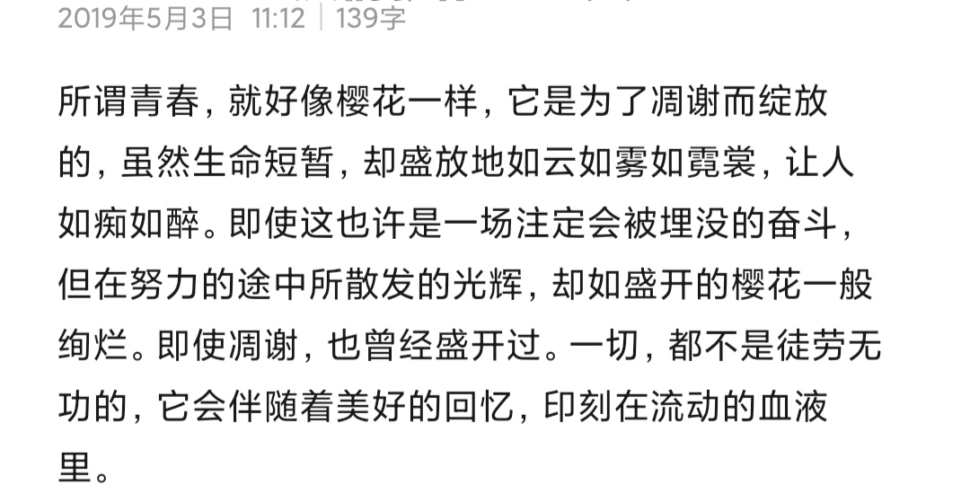 尤子 5年前 樱花庄主题曲热评 记得是中考那时候吧。非常热衷樱花庄,单曲循环樱花庄主题曲很多次,在网易云热评看到了这么一段所谓青春,就好像樱花一样,它是为了凋谢而绽放的,虽... 533 1 0 尤子 4年前 椎名真白对我影响还蛮大的。